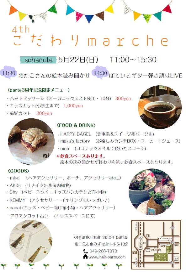5/22にみずほ台のオーガニックヘアサロン parteさんで開催される”4th こだわりmarche”に出店することになりました。